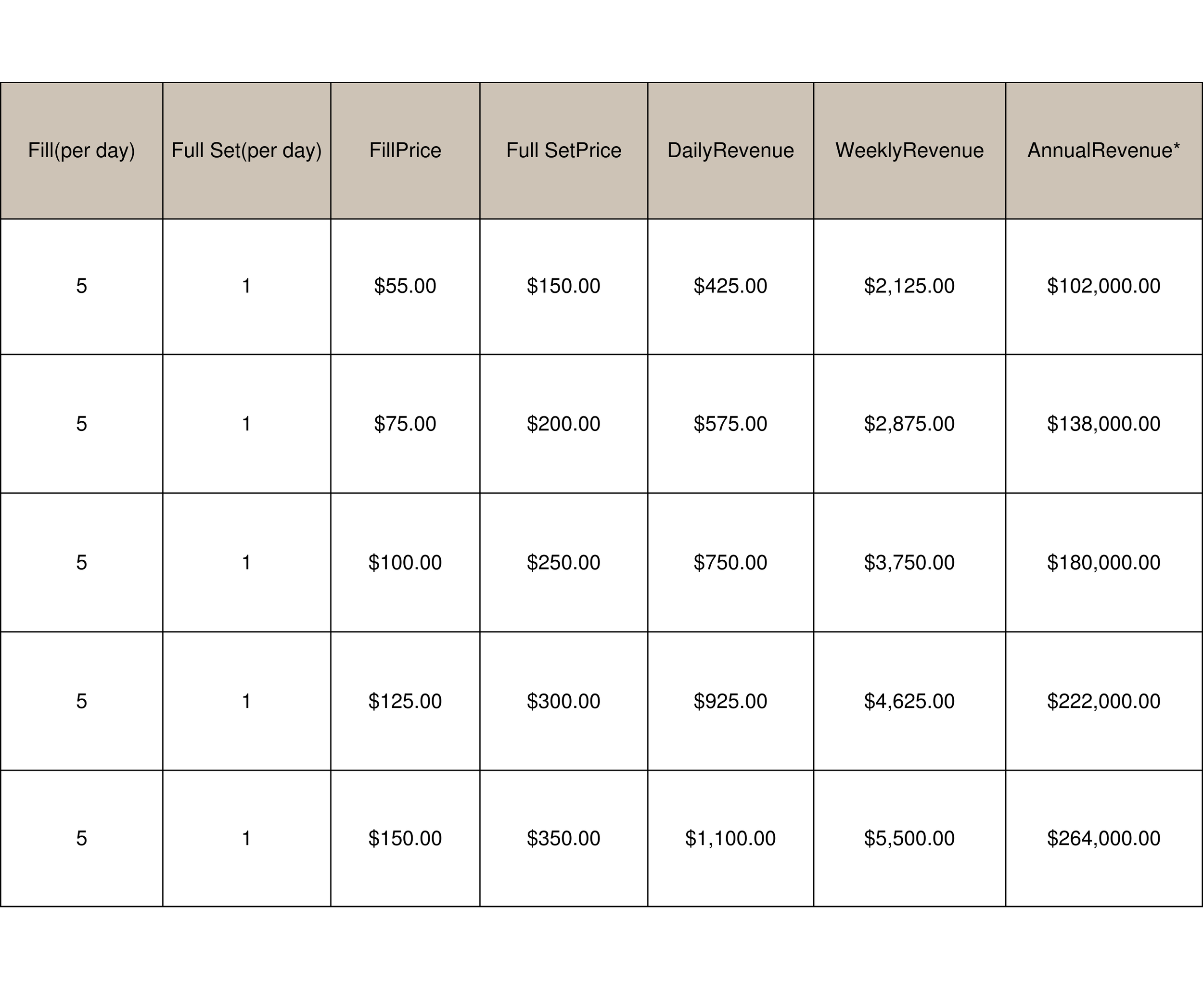 *Annual Revenue is based on a successful full-time Lash Stylist, working up to 5 days per week and 48 weeks per year.